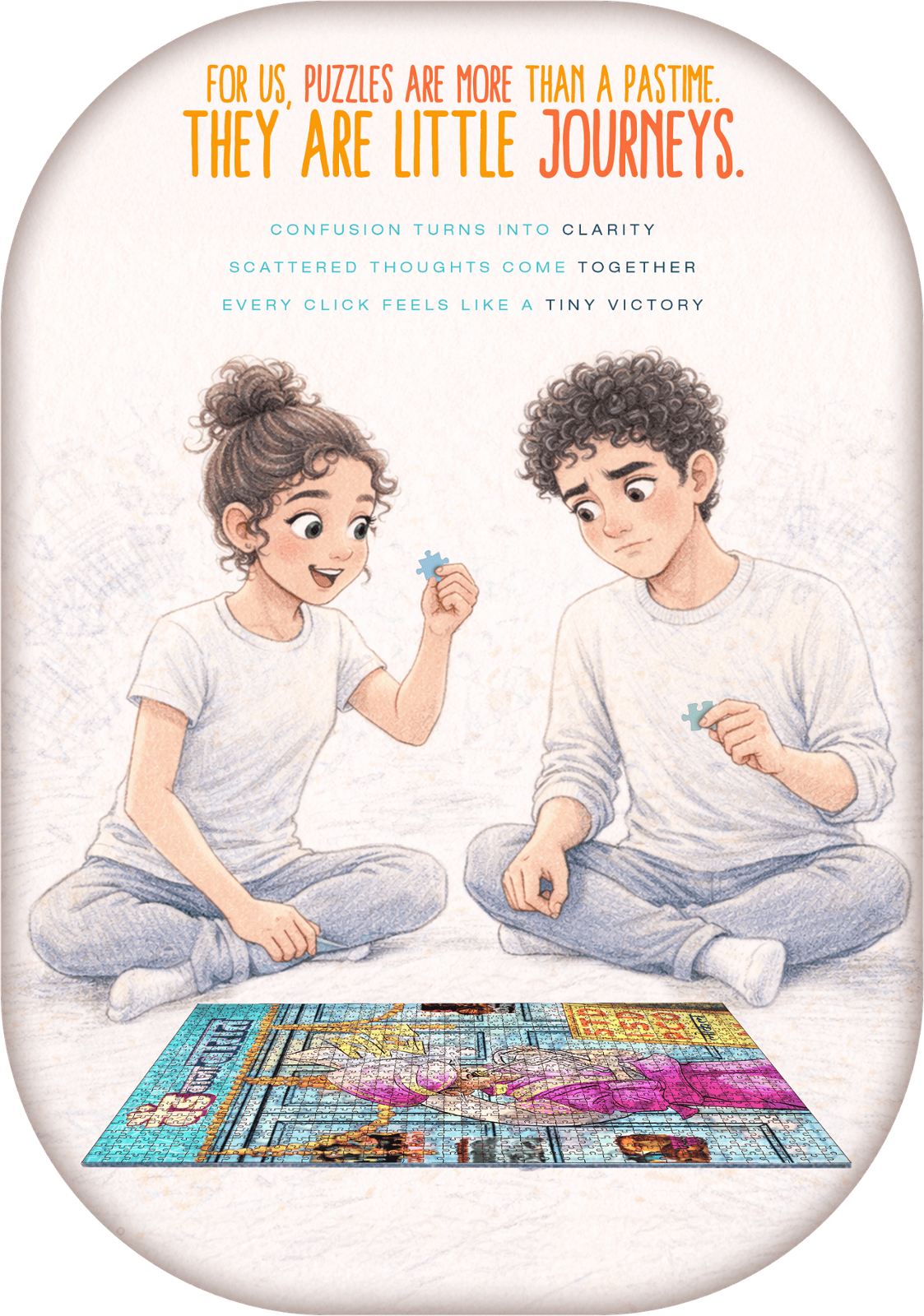 Our story began around a dining table during a quiet evening, with a half-completed puzzle, scattered pieces, and laughter echoing in the background. That moment sparked something. We realised — puzzles are not just games. They’re conversations in silence, mindfulness in motion, and connection in chaos.